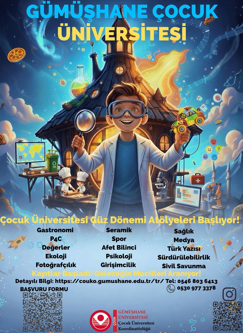 Gümüşhane Üniversitesi tarafından düzenlenen Çocuk Üniversitesi Güz Atölyeleri, 19 – 23 Ocak 2026 tarihleri arasında, her gün 10.00 – 17.00 saatleri arasında günde 3 atölye olacak şekilde gerçekleştirilecektir.